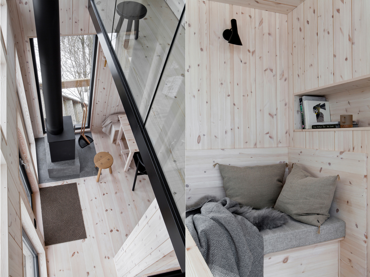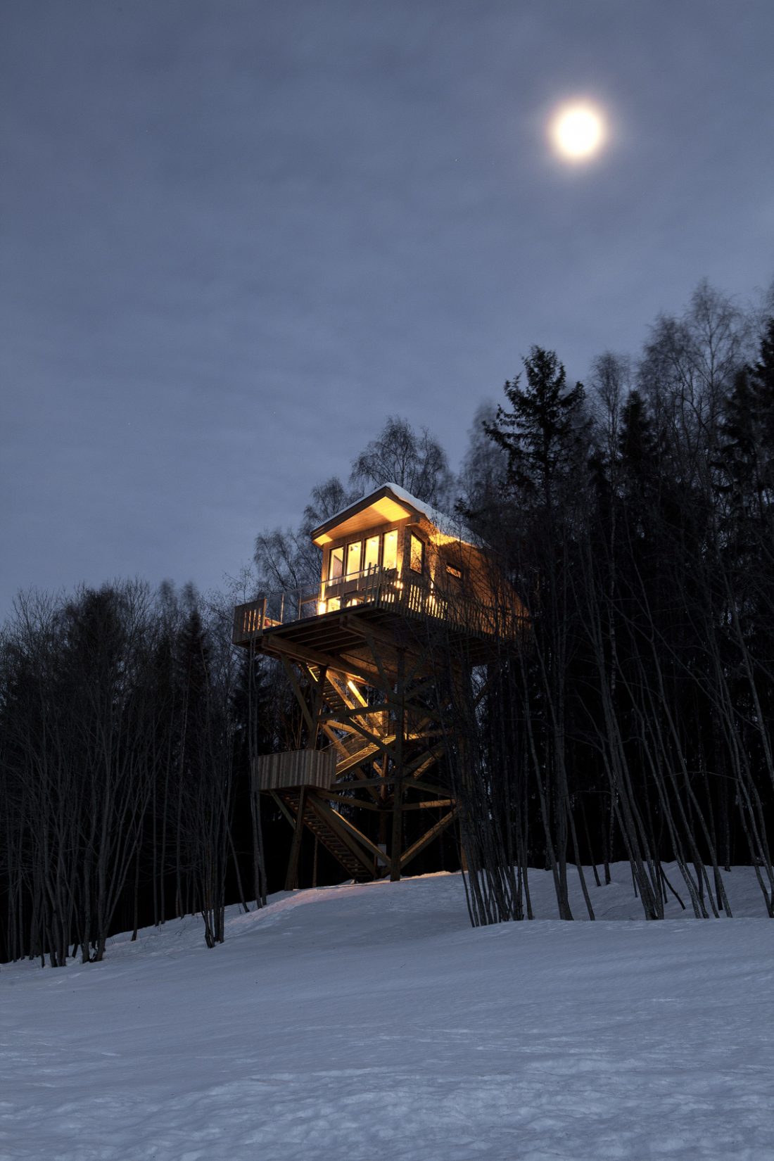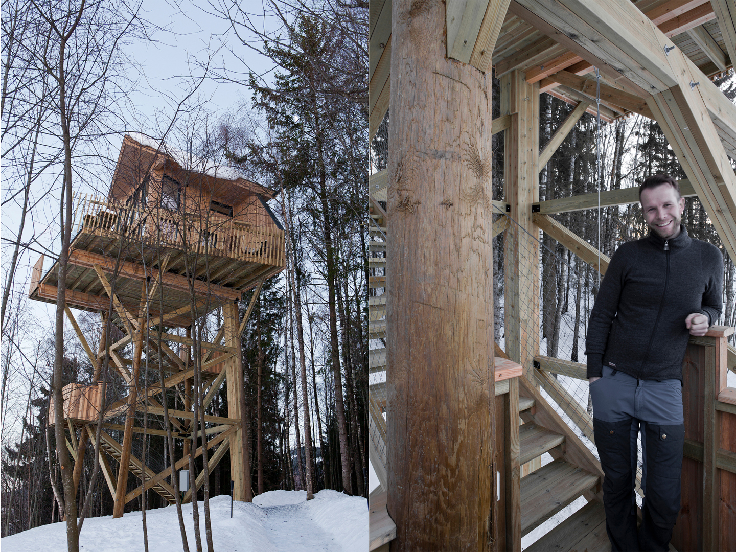 Det er et perfekt sted å kjenne på roen. 11 meter over skogbunnen med tretoppene som beveger seg rolig i en lett bris utenfor vinduene. Høre småfuglene som kvitrer og ekorn som hopper fra tre til tre, forsterker den gode naturopplevelsen. Denne stemningen gir en følelse av at det er naturen som er ditt vertskap, – – og det er vel kanskje det. Ståle Dahl har satt opp den første tretopphytta på Toten. Og det er helt utrolig hva han har fått ut av 16 kvm. Tretopphytta har både strøm og innlagt vann, peis og gulvvarme – og inneholder stue, kjøkken, bad og en hems med 4 sengeplasser. Her kan du våkne om morgenen og følge soloppgangen over Mjøsa. Materialvalget og interiøret er heller ikke tilfeldig. Her er det gjort helt bevisste valg som understreker nordisk minimalisme og norsk kunsthåndverk. Som de første overnattingsgjestene til Ståle må vi bare takke for de gode estetiske opplevelsene og to minnerike dager.
